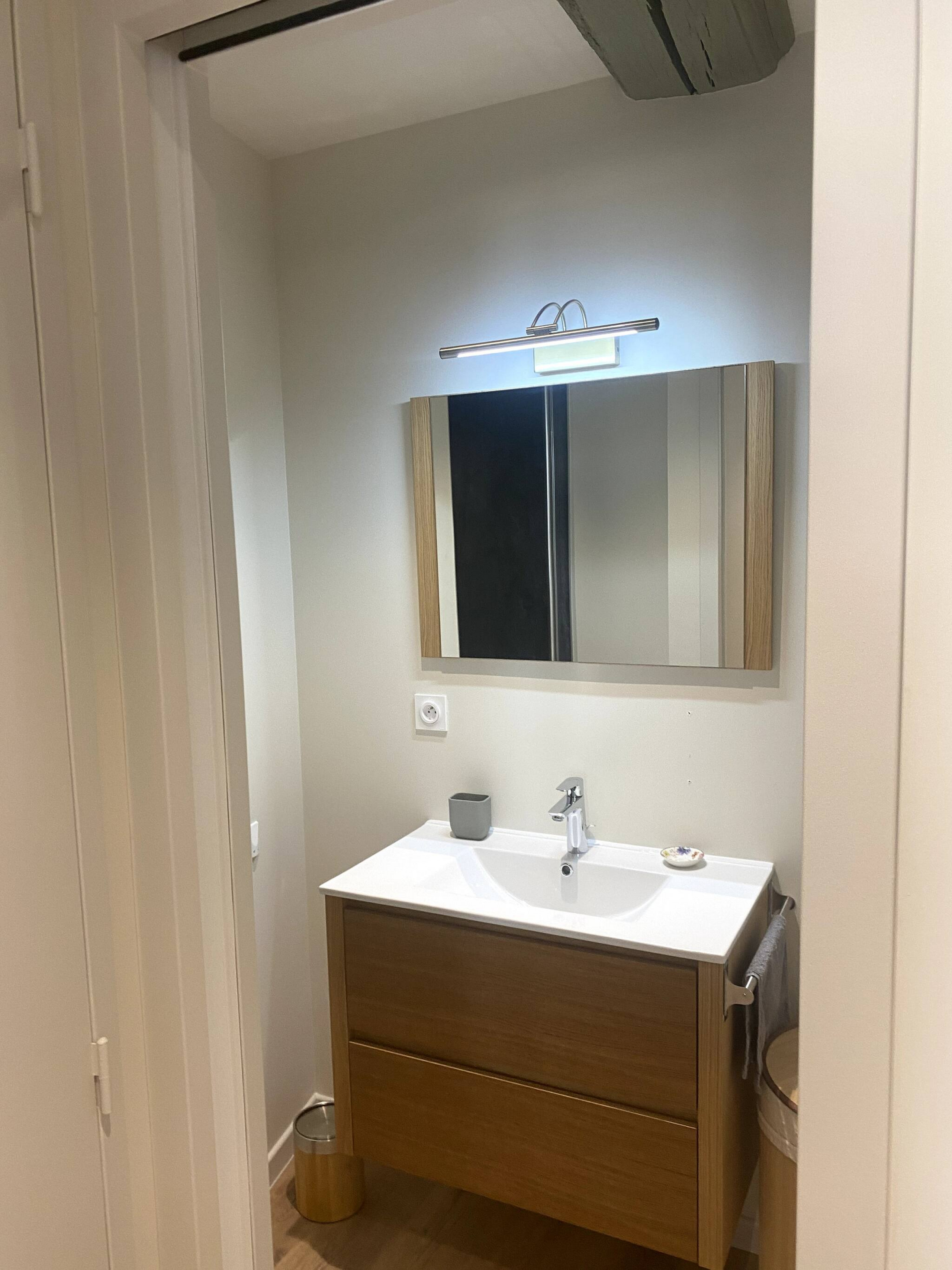 Petite salle de bain avec douche, 1 vasque et WC.