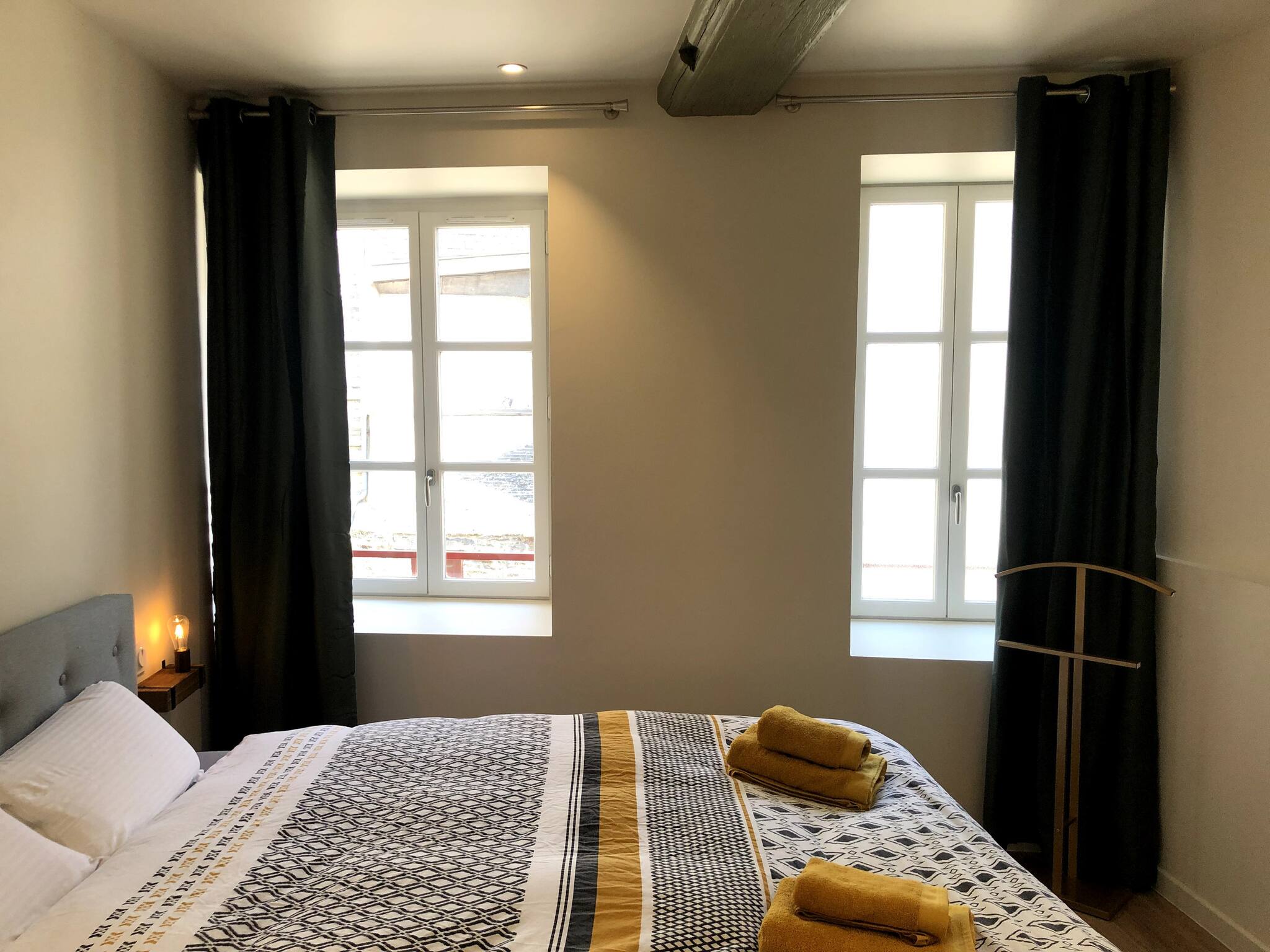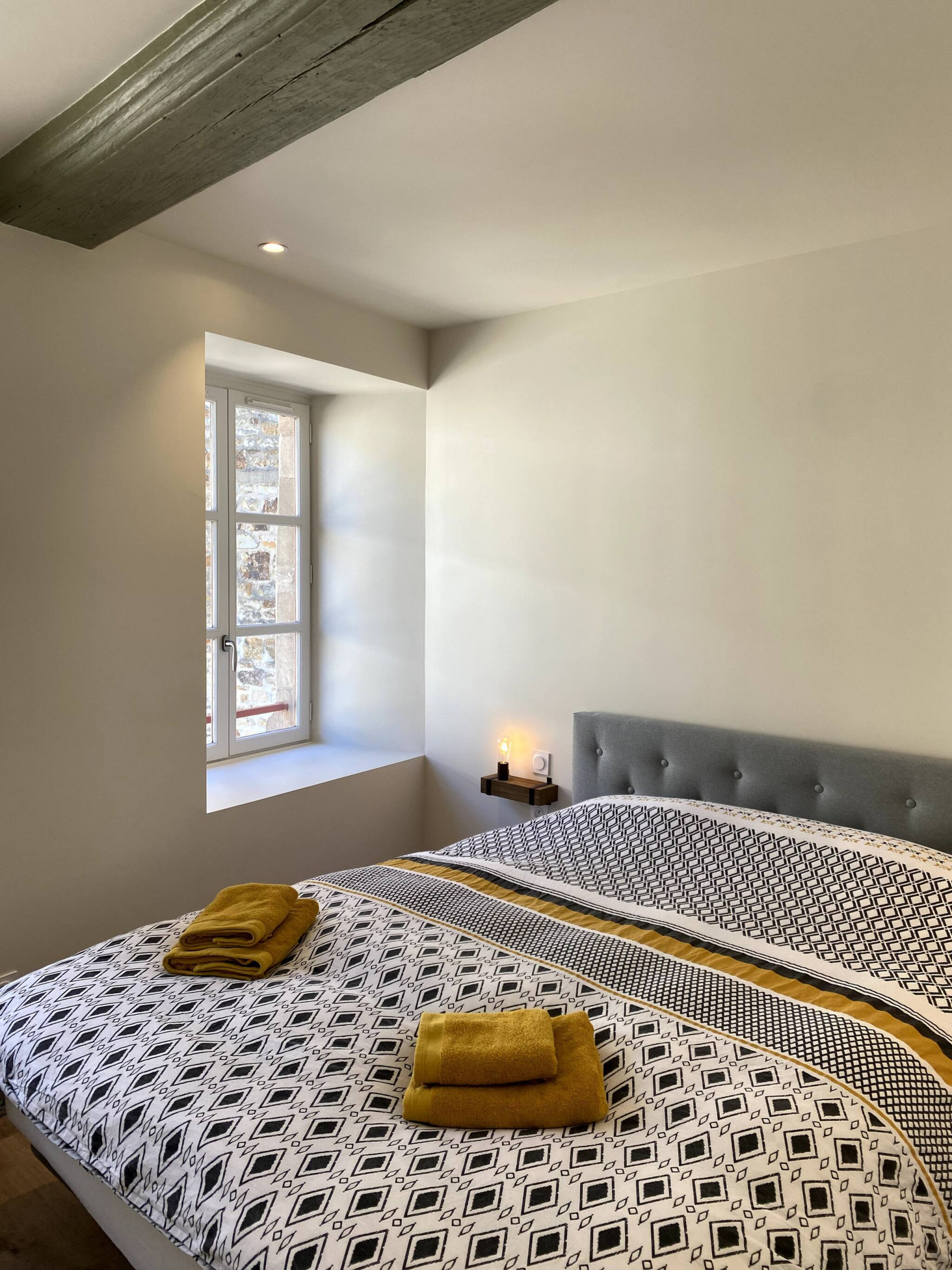 La chambre dispose d'un lit 160 et la loterie est neuve. Très calme car donnant sur l'arrière du bâtiment sans aucun vis à vis.