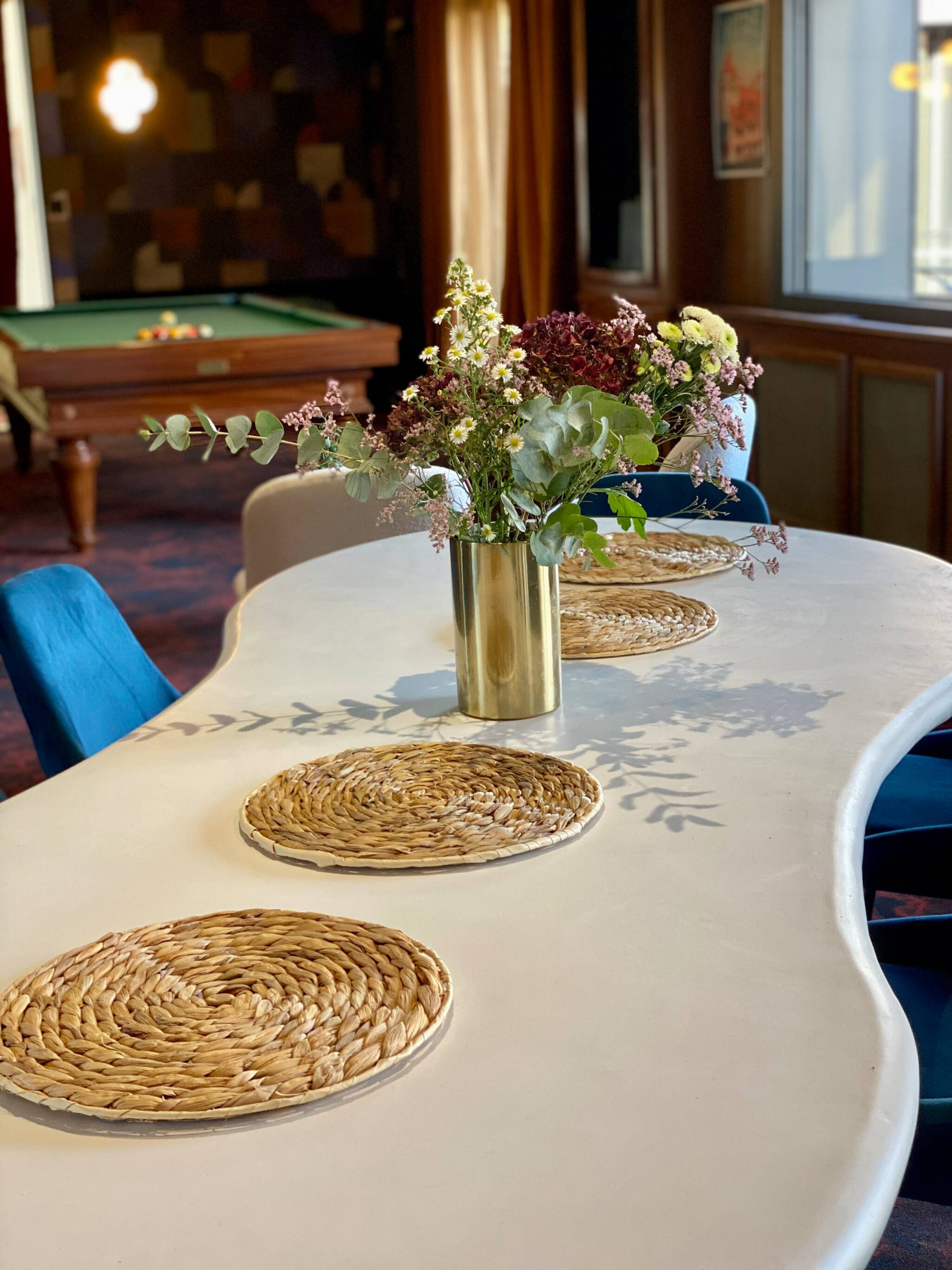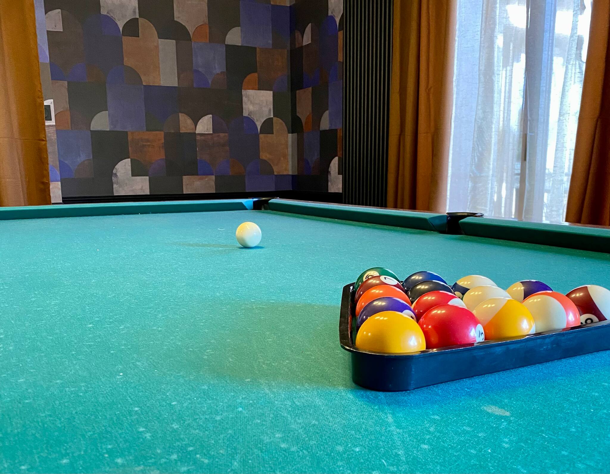 Retrouvez la grande pièce de vie composé de la table à manger et du billard.