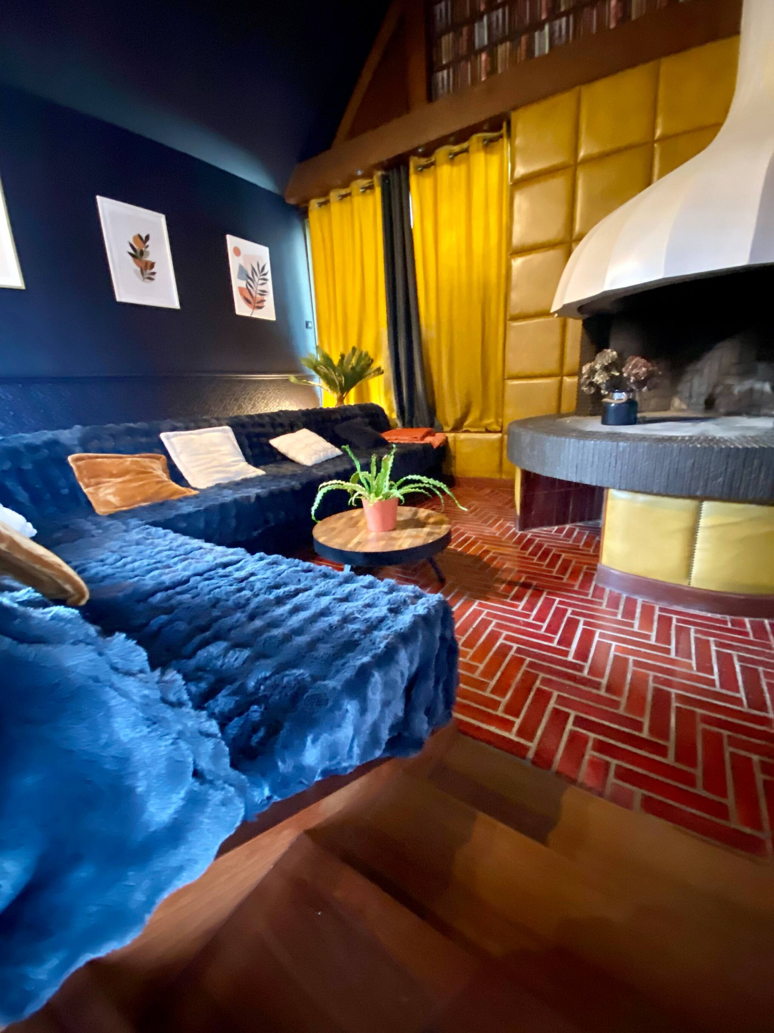 Dans le fond et légèrement en contre-bas l'espace salon et sa grande cheminée à foyer ouvert.
