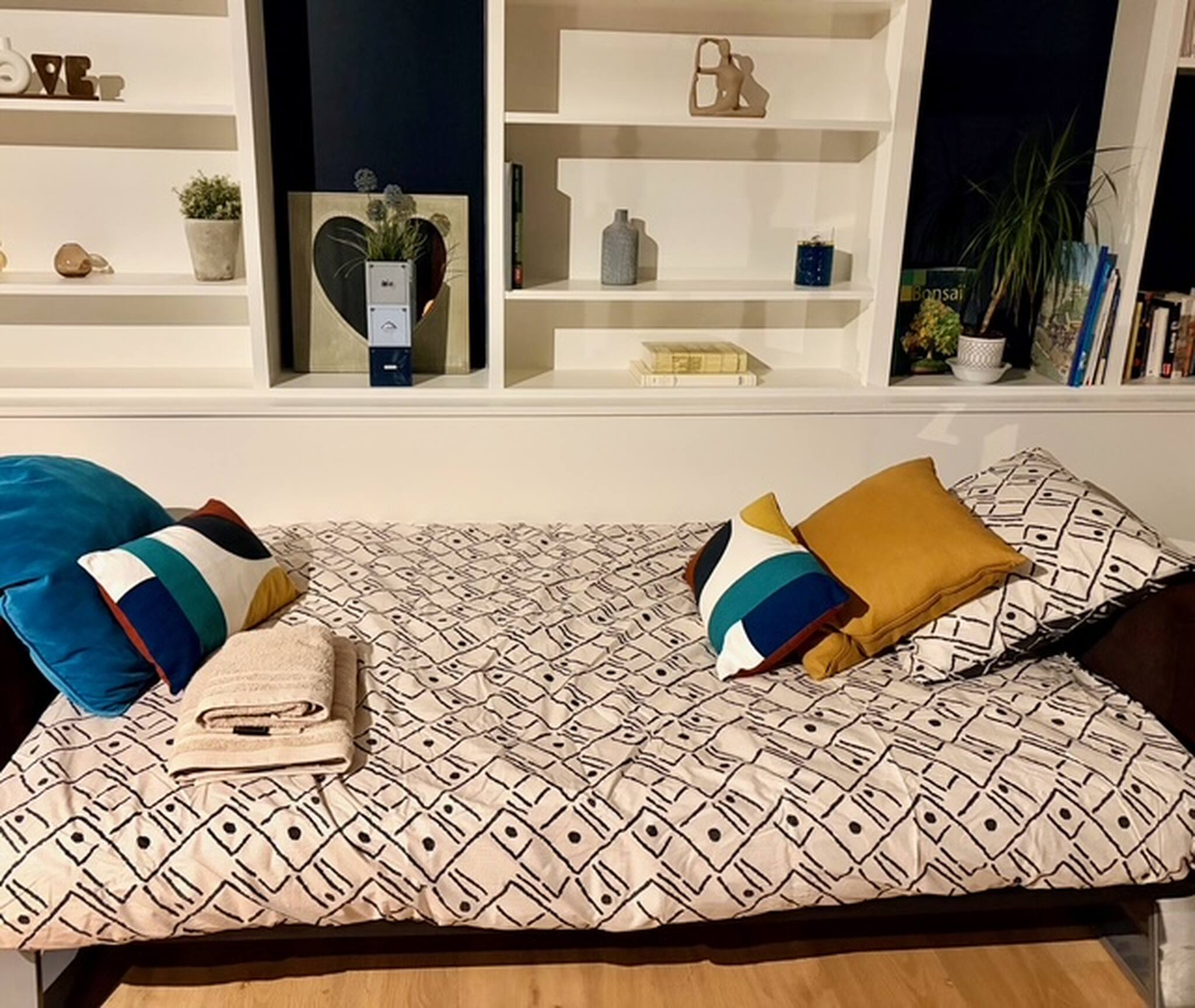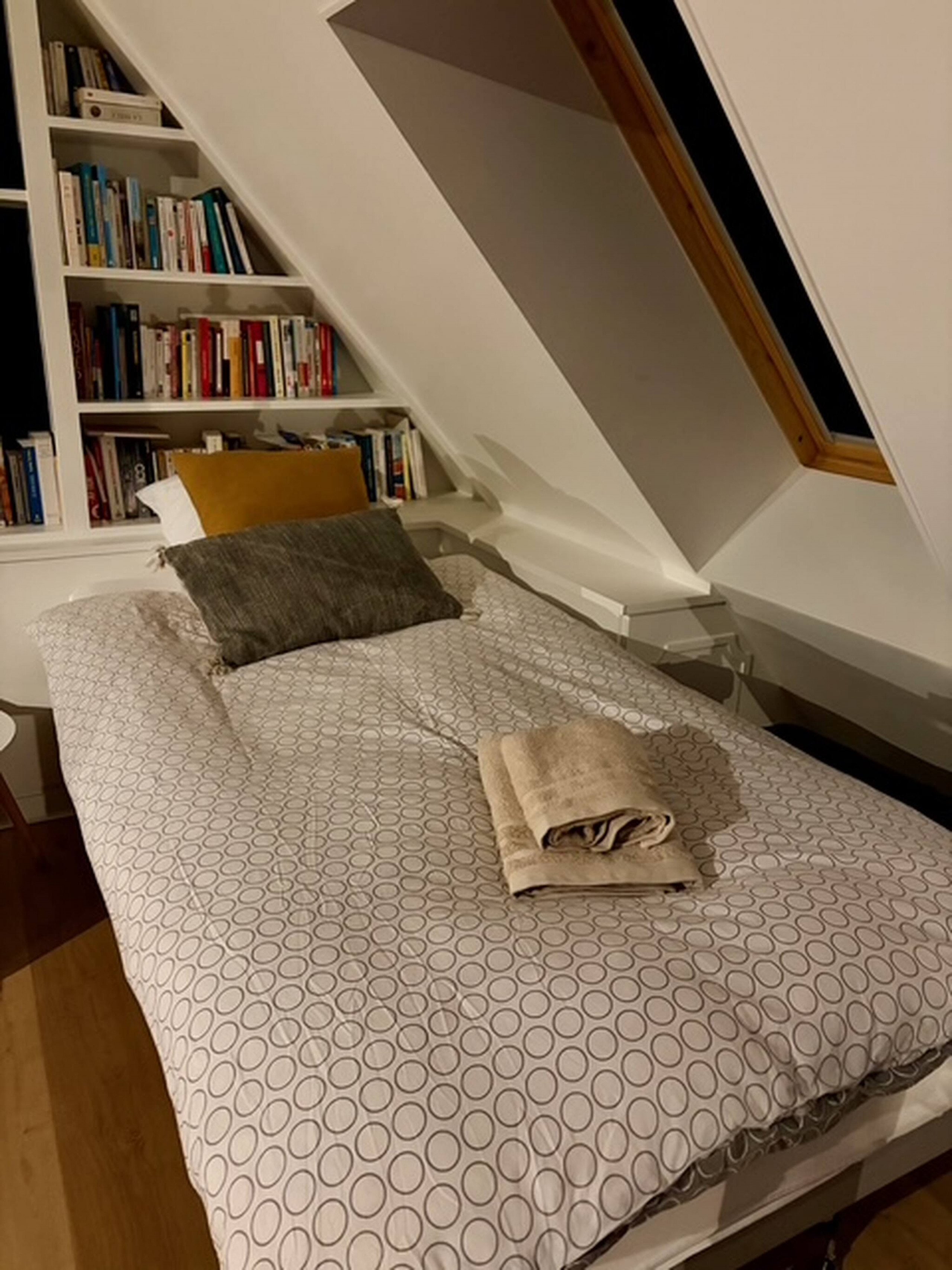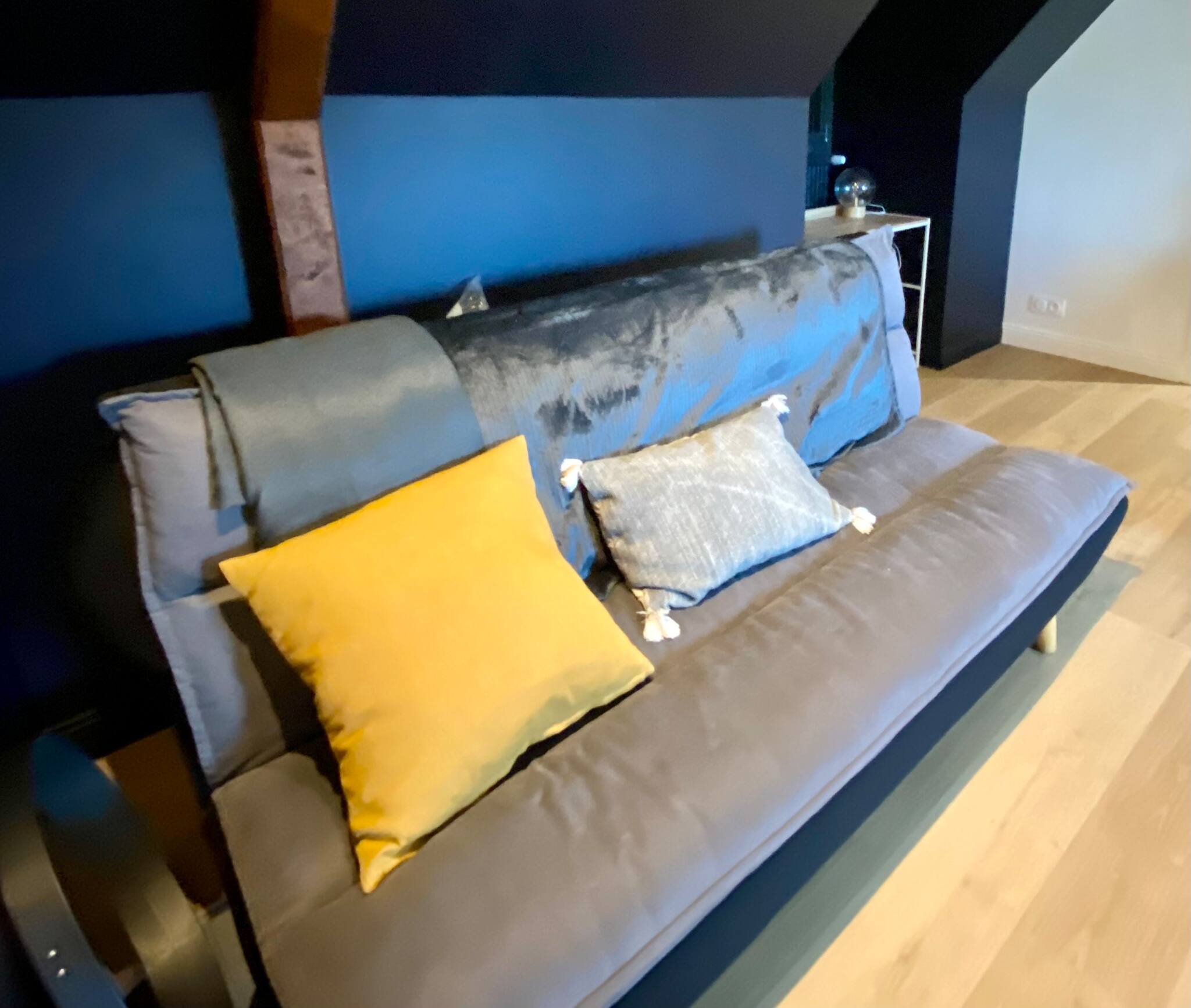 Le palier de la mezzanine est composé de deux canapés lit (120 et 140) et d’une banquette (vrais matelas de lit 90). Des stores aux vélux ainsi que des rideaux occultent cette pièce.