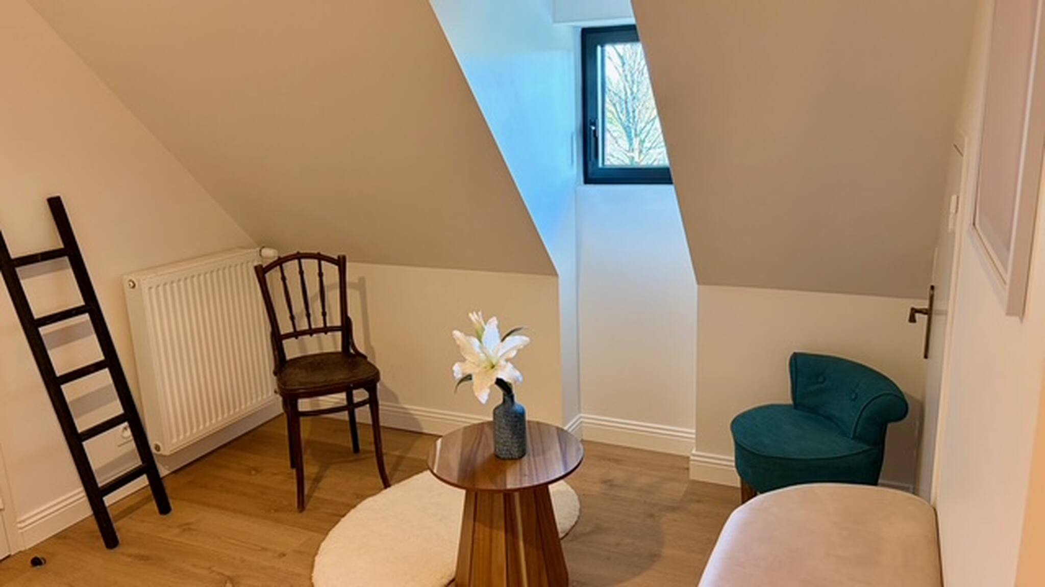 Le tout est articulé autour d’un escalier en colimaçon qui vous mènera à l’espace nuit.