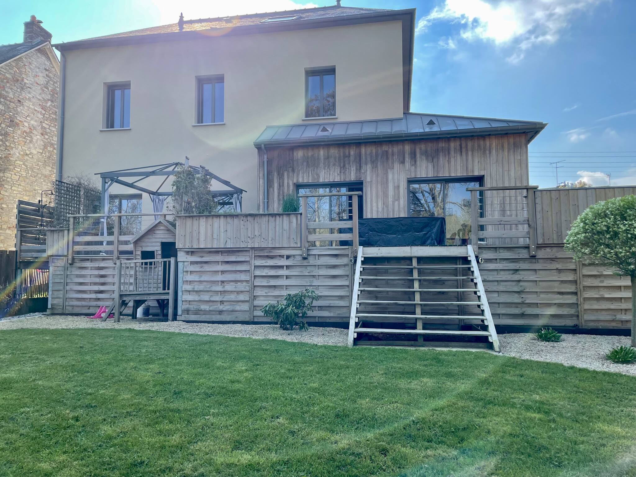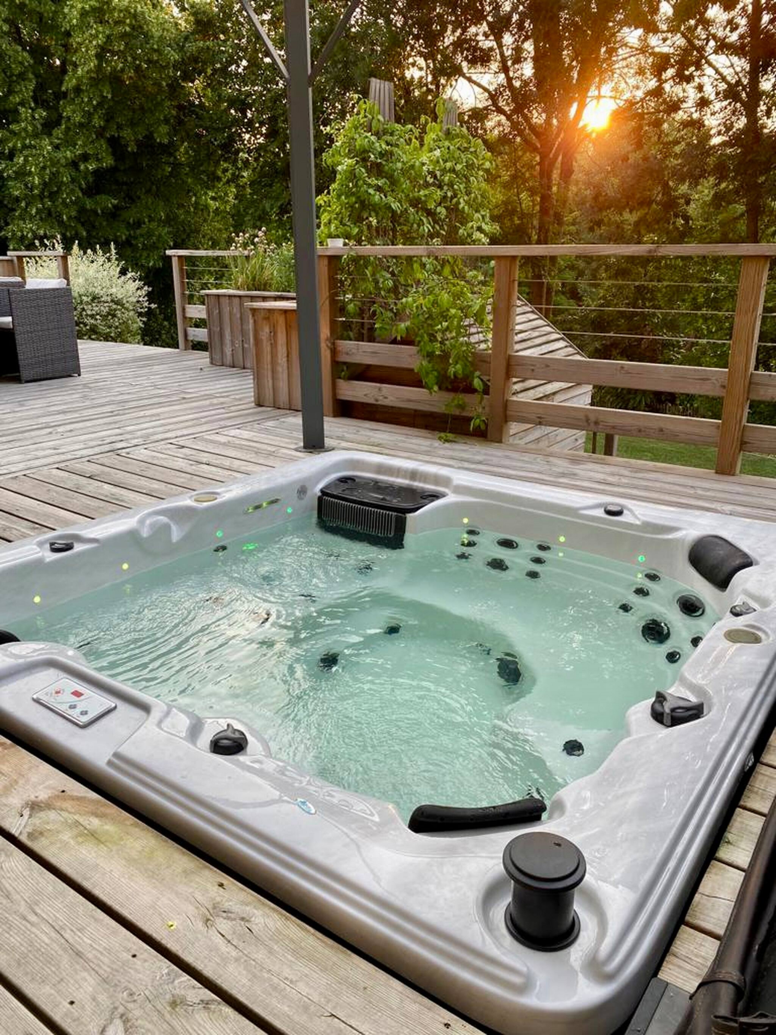 En extérieur salon cocooning, BBQ/plancha, jacuzzi et jeux pour enfants. Accès à la rivière clôturé.