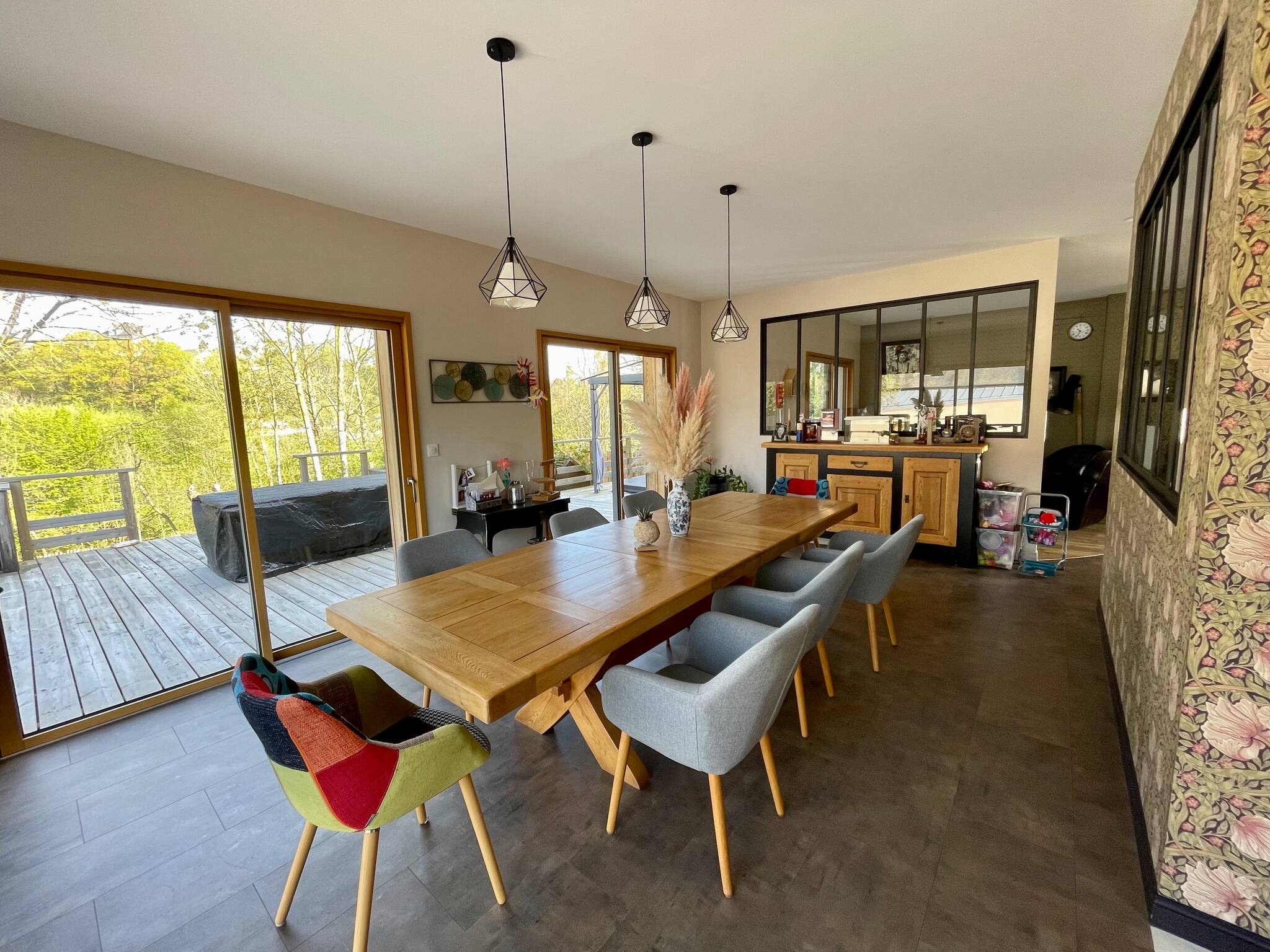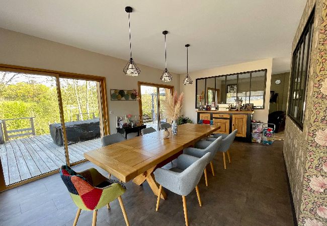 Vous retrouverez au rez de chaussée: la cuisine tout équipée séparée de la salle de séjour par une verrière. Une grande table à manger pour partager des repas conviviaux puis l'espace salon. La chambre parentale (lit 180) et sa salle de bain balnéo. Le tout avec un accès directe à une grande terrasse en bois légèrement en auteur du jardin. Comprenant un coin salon, une table, une plancha et le jacuzzi.