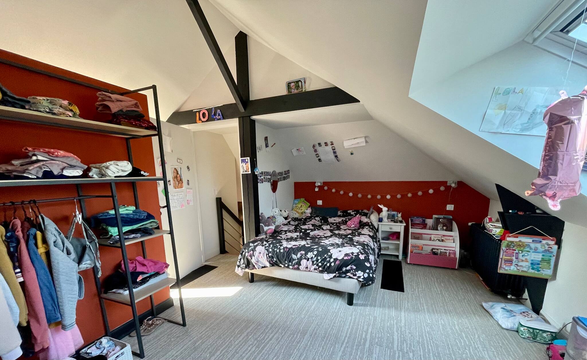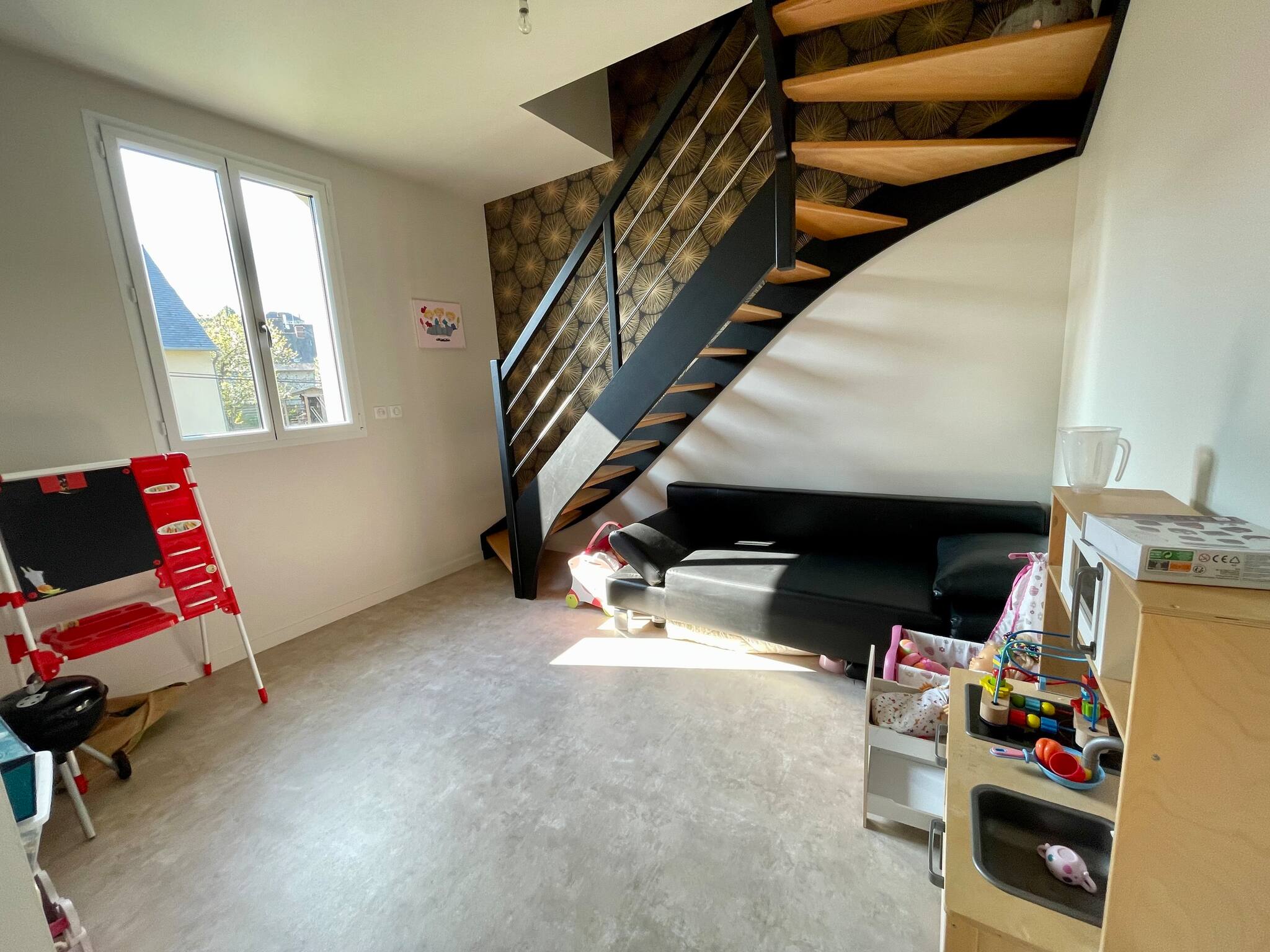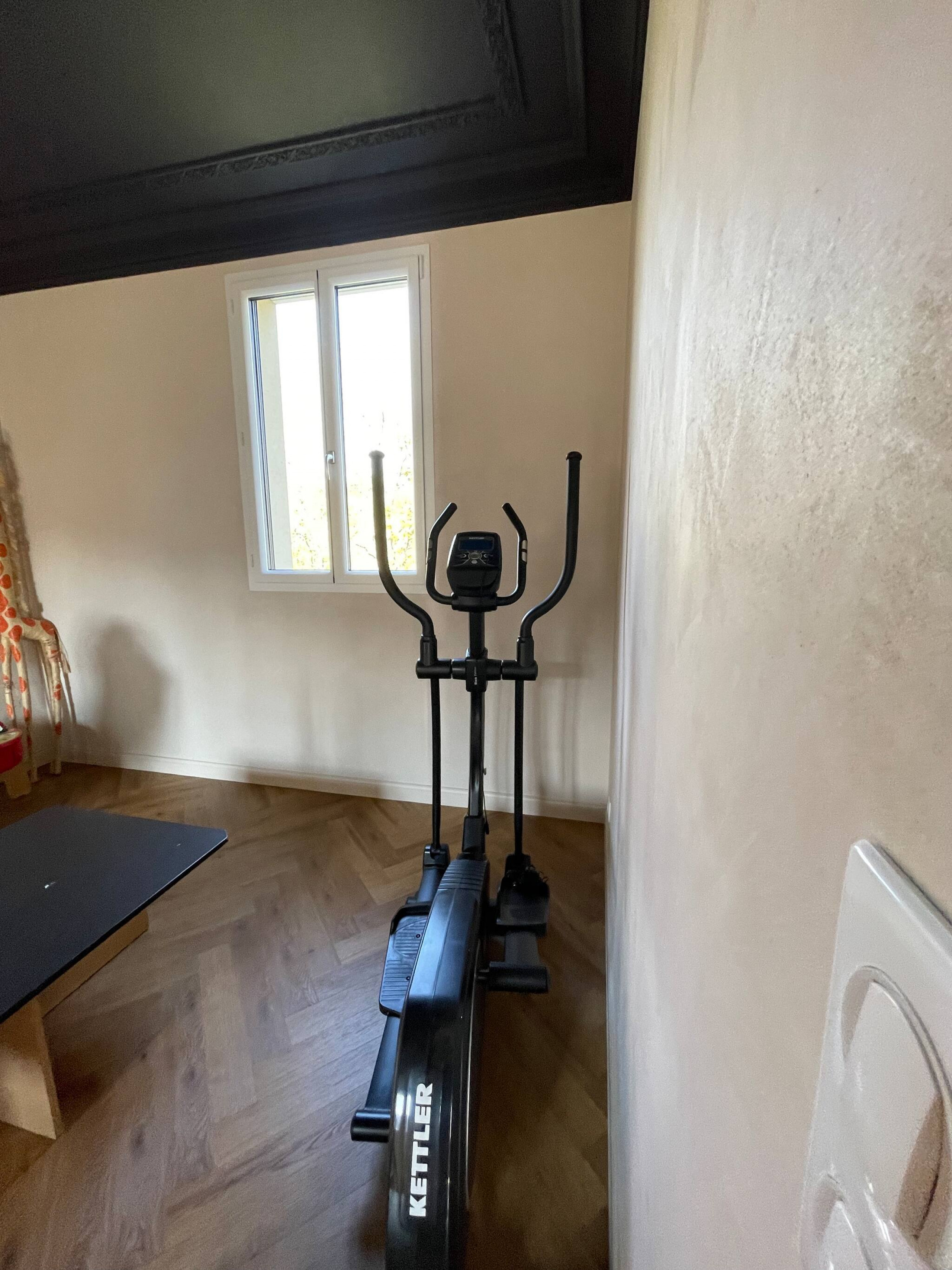 Au premier étage se trouve le vélo élliptique sur la mezzanine, la chambre bébé ainsi que la chambre enfant. Une salle de douche et un WC séparé.