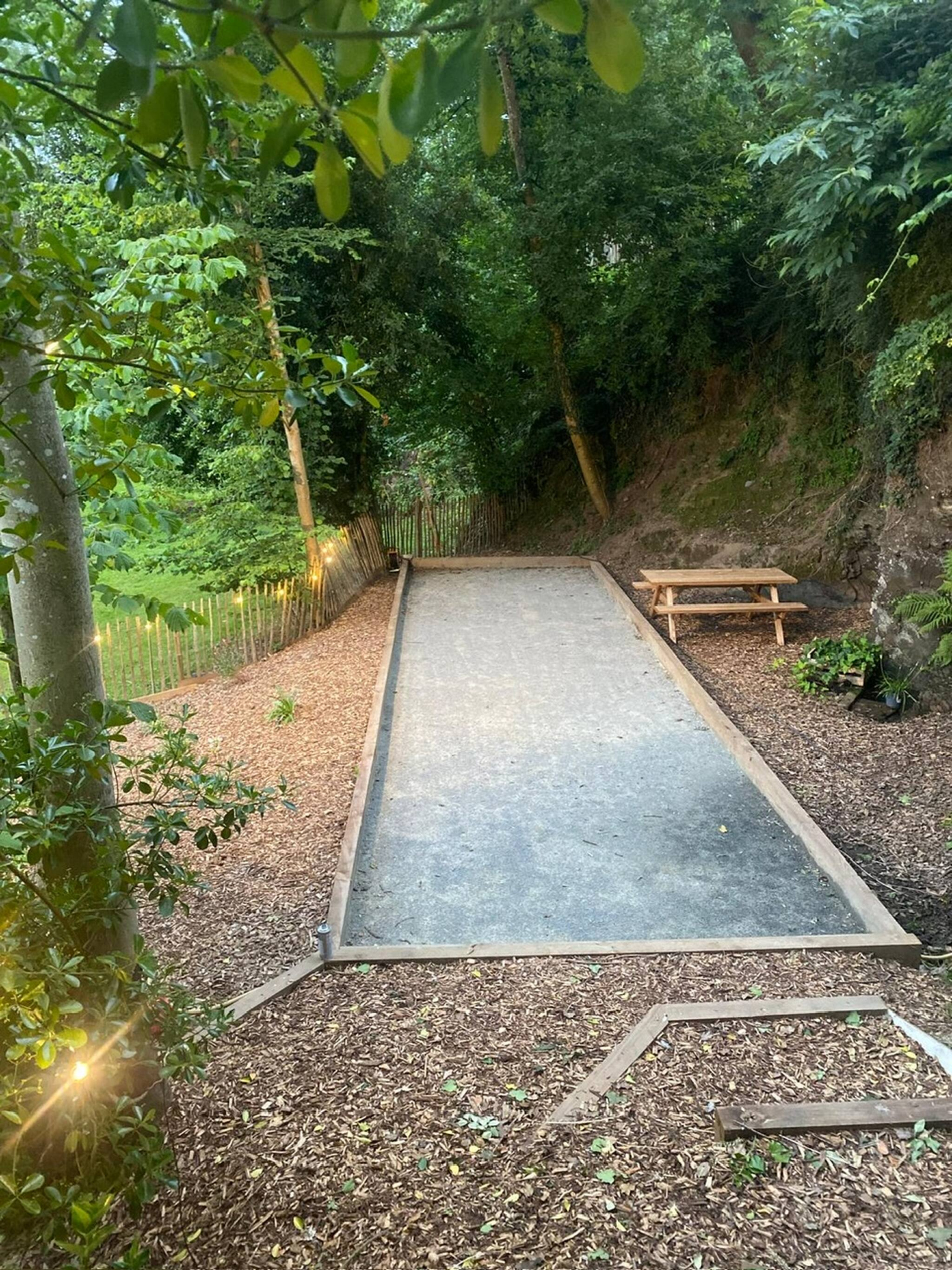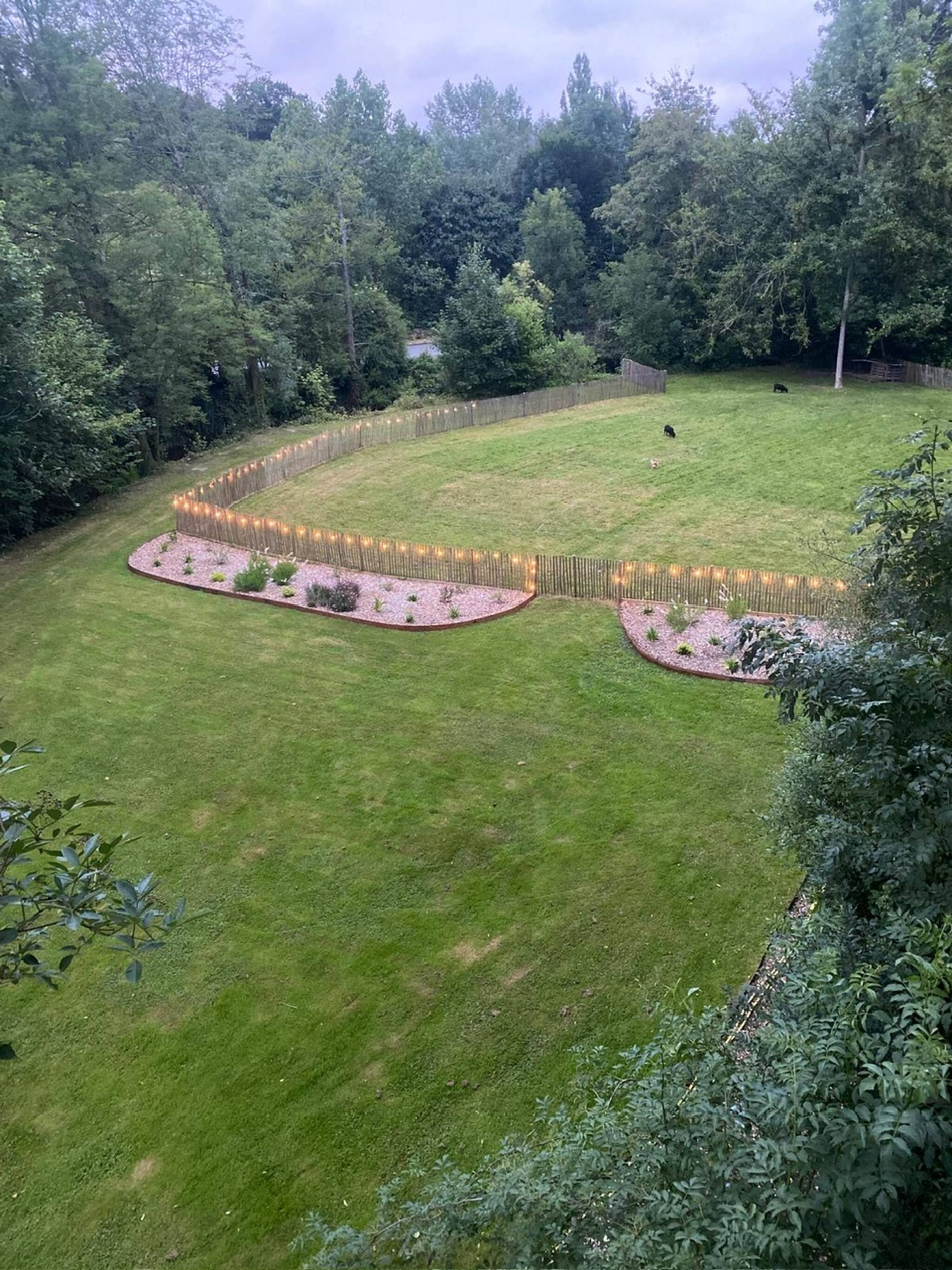 En contre bas du jardin se trouve un espace clos pour nos moutons et l'accès à la rivière. Pour les amateurs de pêche un ponton à été aménagé.